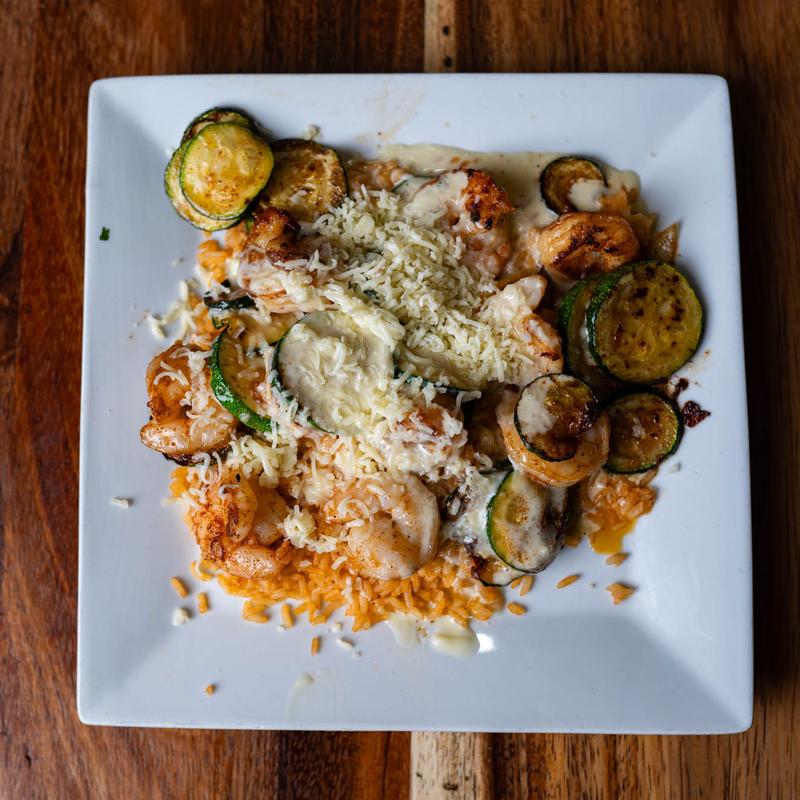 A mixture of grilled shrimp, scallops and crab meat topped with queso dip.